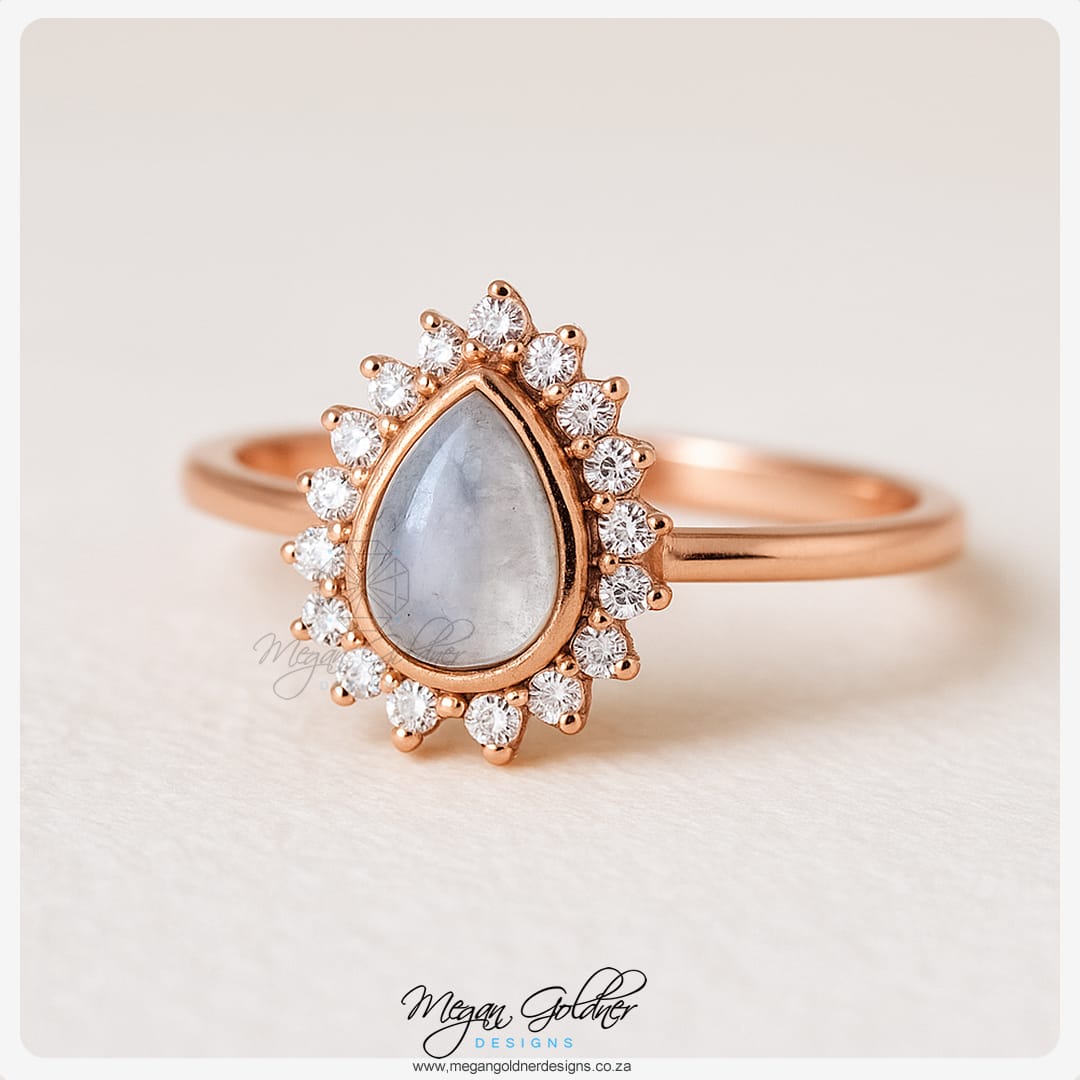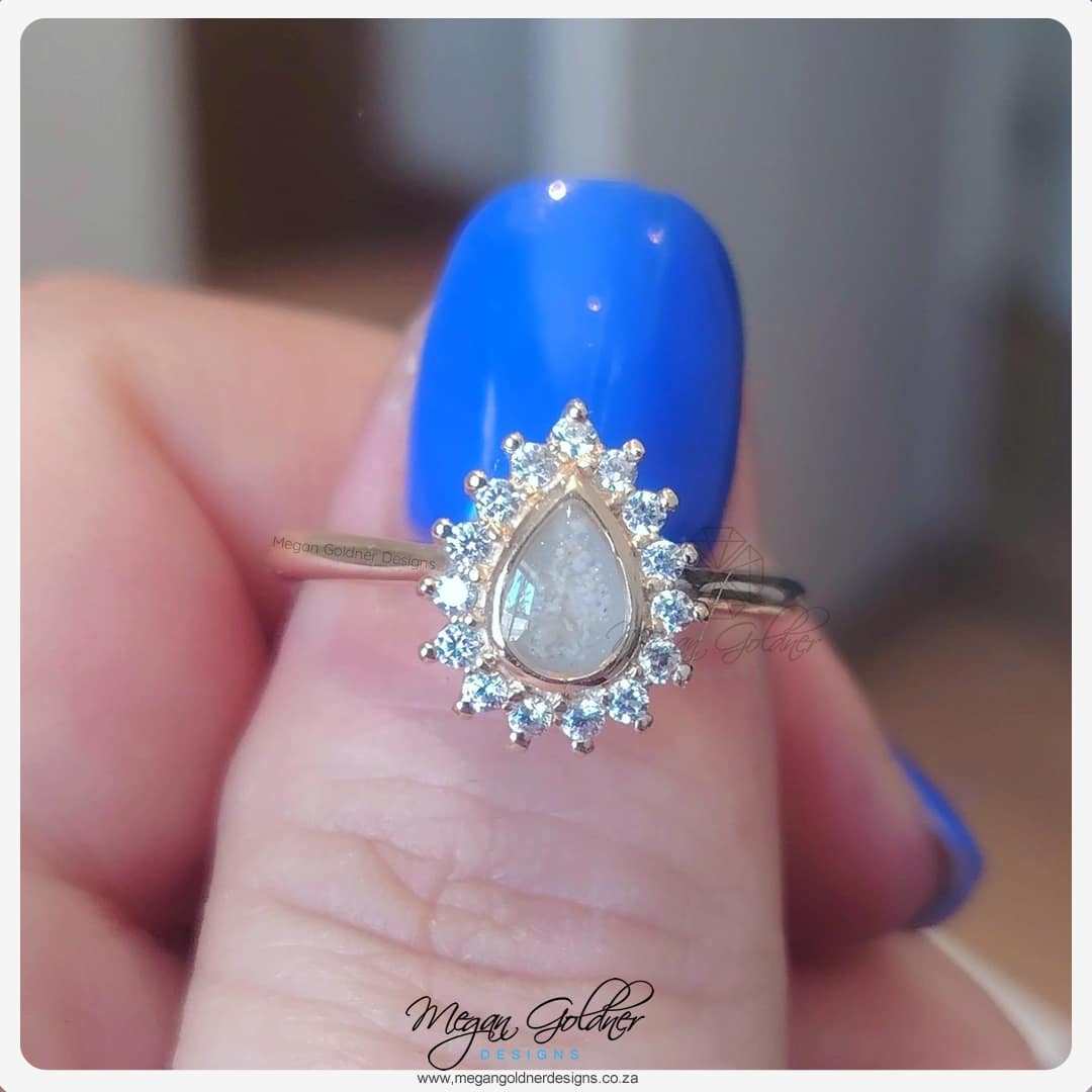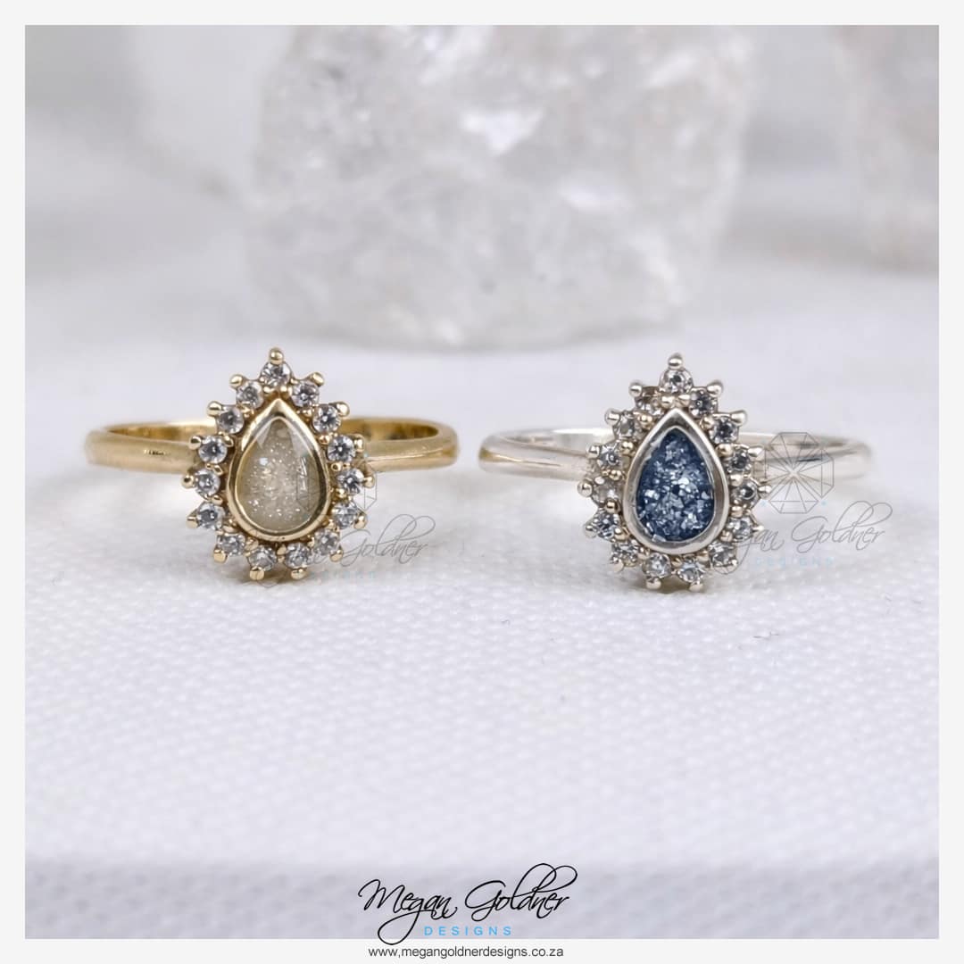 This stunner features a pear-shaped centre Keepsake stone with a starburst halo Cubic Zirconia stones.